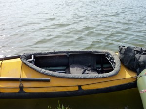 The long strap loop running clipped to the seat base via the second seat mounts used to clip to a small Peli box which doubled as a footrest. I remember now: to use solo you flipped the front seat to face the other way, replaced the back seat with a footrest pillow and moved the skeg to the other end. That’s why my boat unusually has the valve and PRV at the front. But for a good brace the reach was too great, even for my legs. I prefer my plastic drainpipe idea but that needs a couple of added D-rings. As it is, the seat could probably go back a bit further for solo use, so it may have to be a box or some other bodge, as my legs definitely won’t reach. Or maybe I can just do without a footrest which only really matters on long or dynamic paddles. These days I prefer a Peli under my knees where I can actually get to it without having to do 45 minutes of hot yoga.