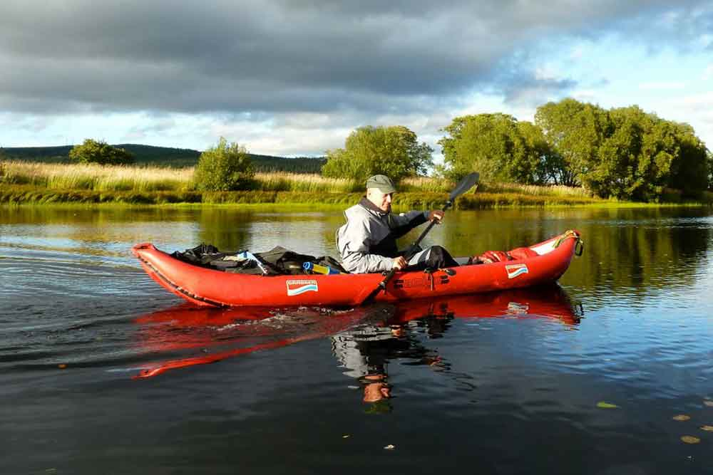 I fitted the Gumotex plastic skeg to my Grabner Amigo IK (above) and at sea used it all the time. But on the shallow River Spey (below) this boat didn’t handle at all well without a skeg, possibly because the tailwind pushed the kicked-up stern around. It was really quite annoying because a few years earlier my broadly similar Sunny managed the Spey just fine without a skeg, so skeg-free tracking clearly varies from boat to boat.
