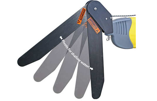 I’ve often thought a hinged retractable skeg would be a good idea: it would pivot backwards when dragging in shallows, then drop back down when there’s enough depth. It seems SUPs need skegs and in the US, FrogFish have made such a thing for boards, but you hear the spring can be a weak point. If your kayak has a rudder mount (or you can make one), another way of doing it is fitting a swing-down skeg similar to kayak rudders. It works the same way as a rudder with a looped cord swinging the skeg up over the stern, or down into the water. The pivot skeg shown top right is made by Advanced Elements for their AirFusion IK and costs about $/£80. Or have a look here.