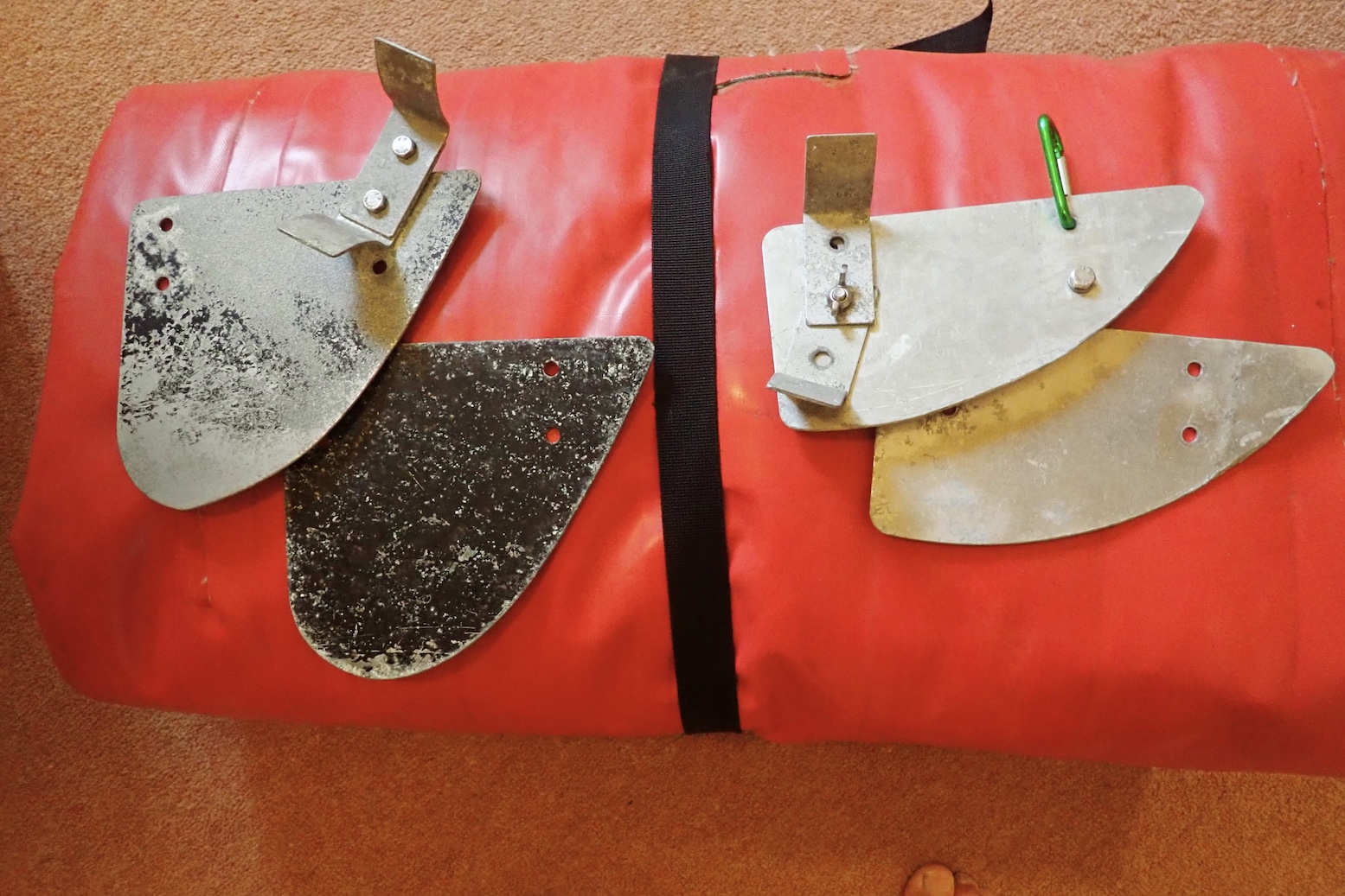 Underneath it has that crappy old Gumotex alloy skeg system – and at each end, too. Did I do that? The original oversized alloy skeg is deeply corroded along the smaller ones I got made, and even sold to fellow Gumotards. A modern plastic skeg needs a different patch but I bet there’s a way to adapt the alloy patch to take a plastic skeg. Below, a picture of new and old skegs on our old Solar 300.