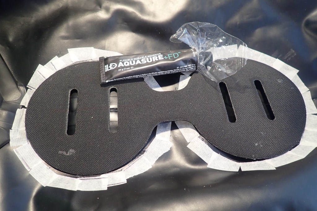 Years ago Gumotex introduced a slip-on, black plastic tracking fin (skeg, above) which was near identical in shape to one I’d had made to replace the old-style oversized alloy skeg (left). A smaller skeg made better clearance and still tracked fine. But metal bends; tough plastic is much better and that’s what all their boats come with now. I’ve fitted these plastic skegs to older Gumotex IKs and other IKs. The kit is about £25 + glue, and the plastic skeg is pretty much unbreakable. Just make sure you glue the mounting patch on really well; it helps if your boat is made from a matching rubber fabric as the supplied Nitrilon patch or make your own patch from same fabric. But I have glued PVC to rubber successfully – use good two-part glue. The pictures below help you see where to position a skeg.