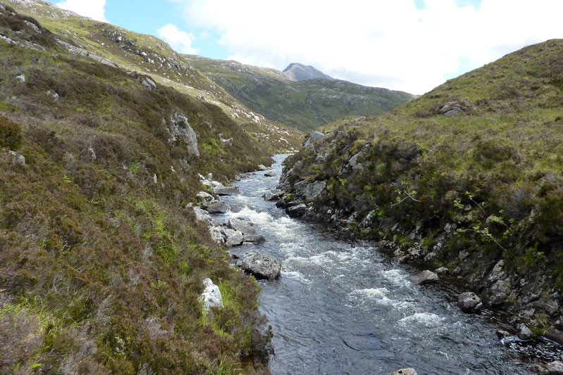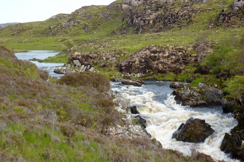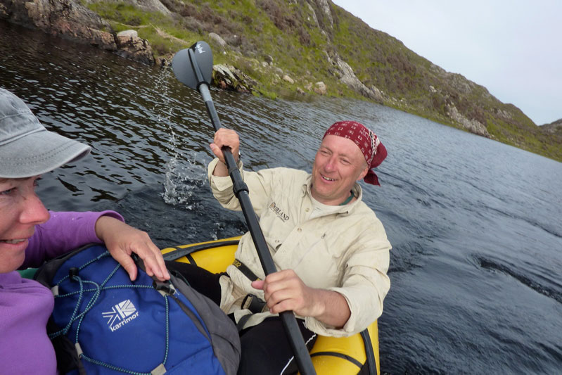 We emerged onto the west end of Sionascaig loch (above) surrounded by the dramatic mountains of the Assynt, and turned south for the sluice. Being thorough, we tried sat right back without the bag one more time, but got the same high-bow yawing. Even with the bag I still observed some yawing, but as it was intermittent it could be down to my test pilot’s as yet unrefined packraft paddling knack, just as it can be trying to get a hardshell to go straight the first few times. Yawing is not tracking – this boat will go where you point it, but you’d imagine pivoting is inefficient. A bit like moving off from standstill on a bicycle, my Yak also yaws wildly as I set off, but settles down once there’s some directional momentum, nodding maybe six inches left and right.