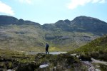 Through the shallow narrows we passed, arriving at the next ‘sluice’ at the end of the loch. It’s actually a runable two-foot drop if you take it fast. Like last time I came here, I wondered about trying it for fun, but chickened out. Beyond the pool below it becomes steep, narrow burn dropping to the next loch. So we tramped through the springy heather made crisp by over a fortnight without rain. We chucked the boats over a nasty wire fence then set off across the last little loch and the short walk back to the car.