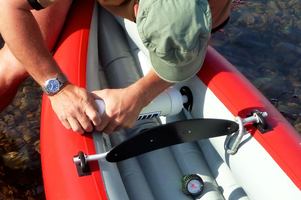 Your inflatable packboat needs a pump to take form as well as to top-up once on the water. These functions may be best performed by two different pumps. The folding bellows footpump (left) is history and even low-pressure IKs now come with some sort of hard plastic barrel pump. Some pump on both up and down strokes to fill your boat faster, but as you reach higher pressures they automatically or manually switch to downstroke-only inflation to reduce the effort. They work best on flat, firm ground where you can stand on the stirrup plates and get stuck in. The excellent Bravo 4 RED Kite pump below (newer ones are blue) is still well under £20 and will pump up an IK in 5 minutes.