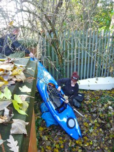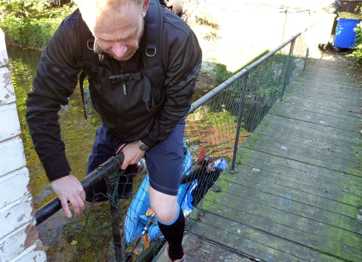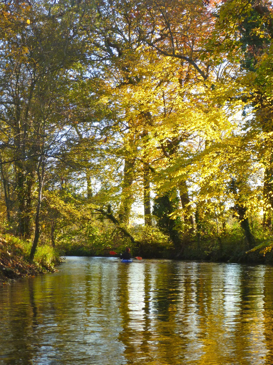 The last mile or two down to Packet Boat Lane passed without rancour as the late autumn sun seeped through the falling leaves. The current was speeding along by now and negotiating a squeeze around a fallen tree and some brambles, Robin managed to low side the unskeged Gumotex at exactly the point where Lois had tipped in on a previous occasion. Luckily he was also in shorts and hopped back in the Solar. Somewhere here there was a blockage of fallen trees and flotsam which we couldn’t paddle through and so made our only short portage.