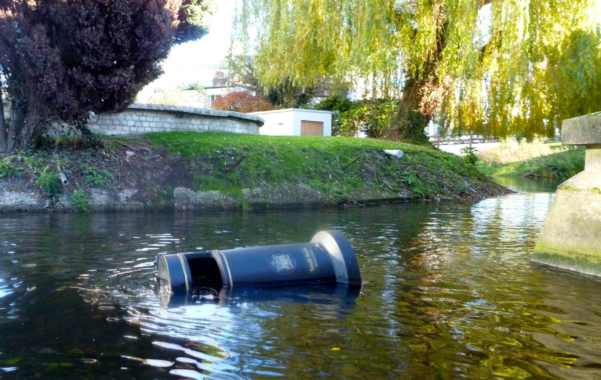 But we’d survived the KWDT and soon cruised past a striking municipal bronze statue depicting a trio of naked nymphs grappling over a giant Christmas pudding (left), a scene plucked from the otherwise unexceptional Lost Chronicles of Uxenbride discovered not far from Kebab Galaxy in 1892. And here at last! A plucky South Bucks District Council dustbin uprooted from it’s roadside vigil and flung into the Colne by some beer-crazed revellers high on nitrous oxide. Now that’s what you call urban packboating!