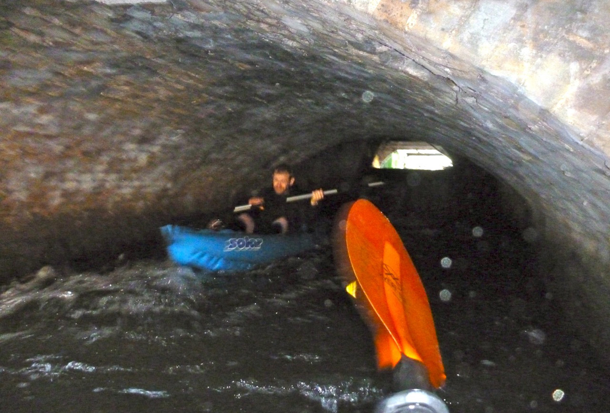 Now reassured that I wouldn’t be pitched out of the packraft to smack, face-first into to a span of festering, greasy brickwork, back at the boat I squeezed myself under the sewer pipe (right) and let the speeding current draw me in, making sure to keep well away from a broad side tunnel which led off to the right and didn’t look like it had a happy ending. I didn’t want to end up being squeezed out of someone’s kitchen tap like rubber-boned Janus Stark. In the main tunnel, the roof bore down and I stowed the paddle as I tipped down the chute, getting shoved against the right wall as I ran out towards the light like a near-death experience.