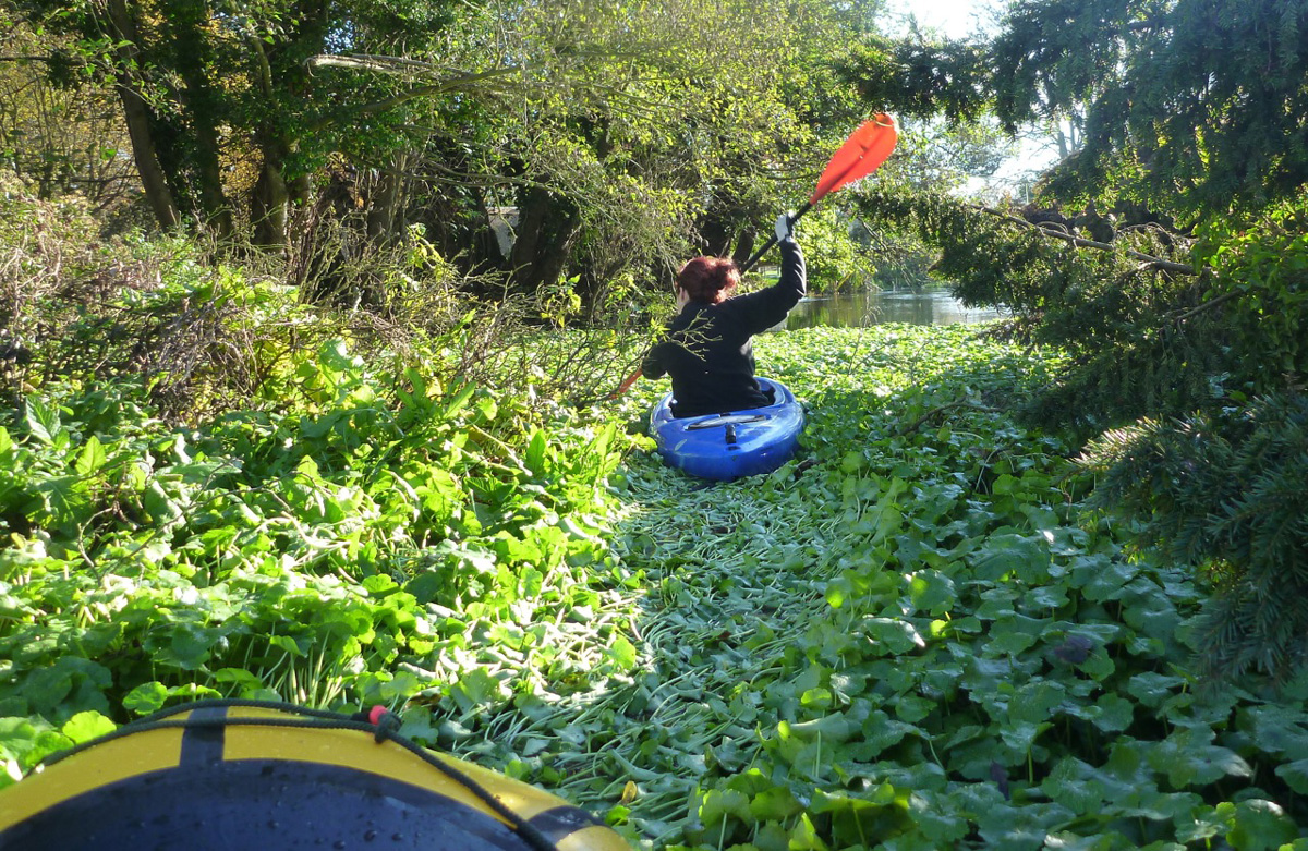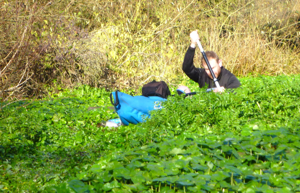 At one point what looked like thick mat of giant watercress carpeted the river bank to bank (actually pennywort, a very troublesome weed I am informed). Up ahead Lois’ Dagger ploughed into the vegetation (left) which amazingly proved to be paddleable, although with my wide, flat-hulled ‘packa I found reaching out and tugging on the floating wortrug worked best.