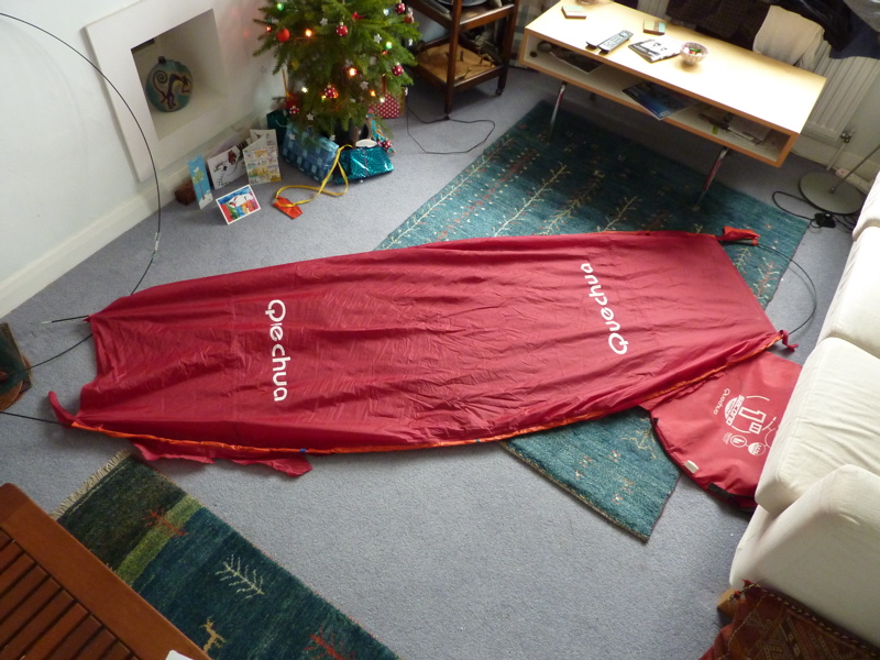 So I took a knife to one of my used Quechua tents. Bad though it felt shredding a perfectly functional shelter, in the spirit of the Inca shaman, it will be reincarnated as a sail – or more ill-conceived clutter to shove under the bed.