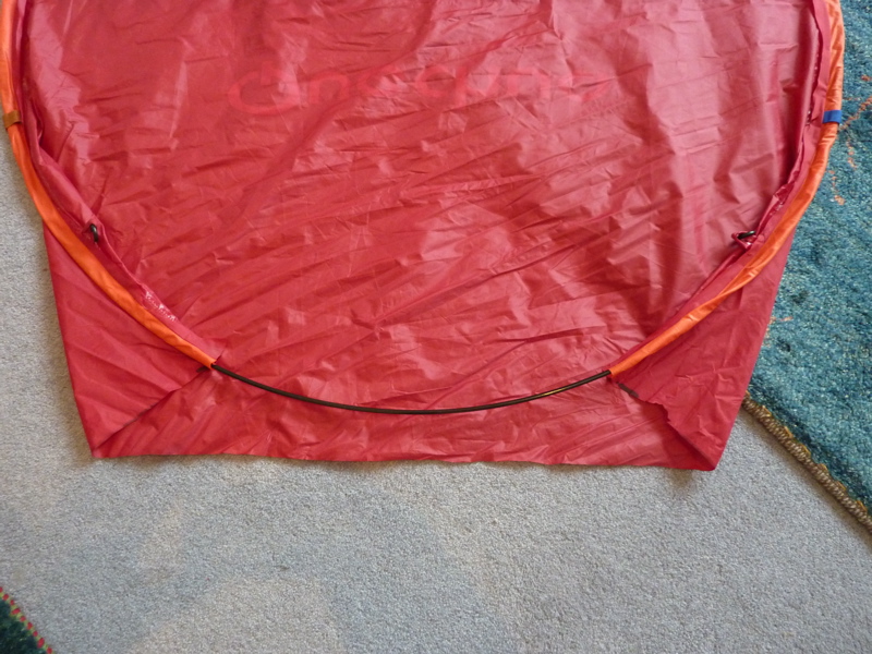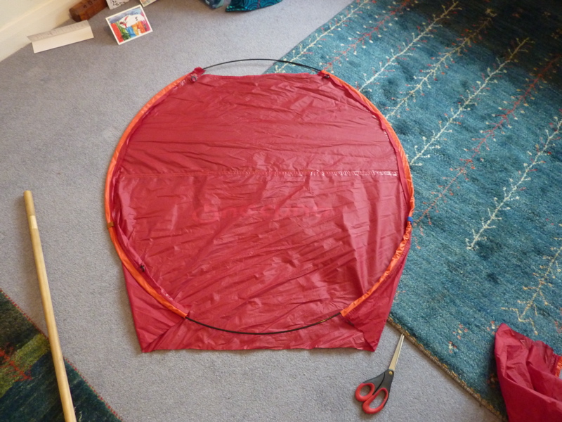 Dismembering the Quechua gives two giant hoops of 4mm nylon-coated alloy and another of 6mm. Having been told that WindPaddles can deform easily under strong winds, I chose the thicker wire to use for the hoop (Gallery pic 2, below) in the hope of reducing this possibility. (Warning: when opened up these springy wires can fly about all over the place).