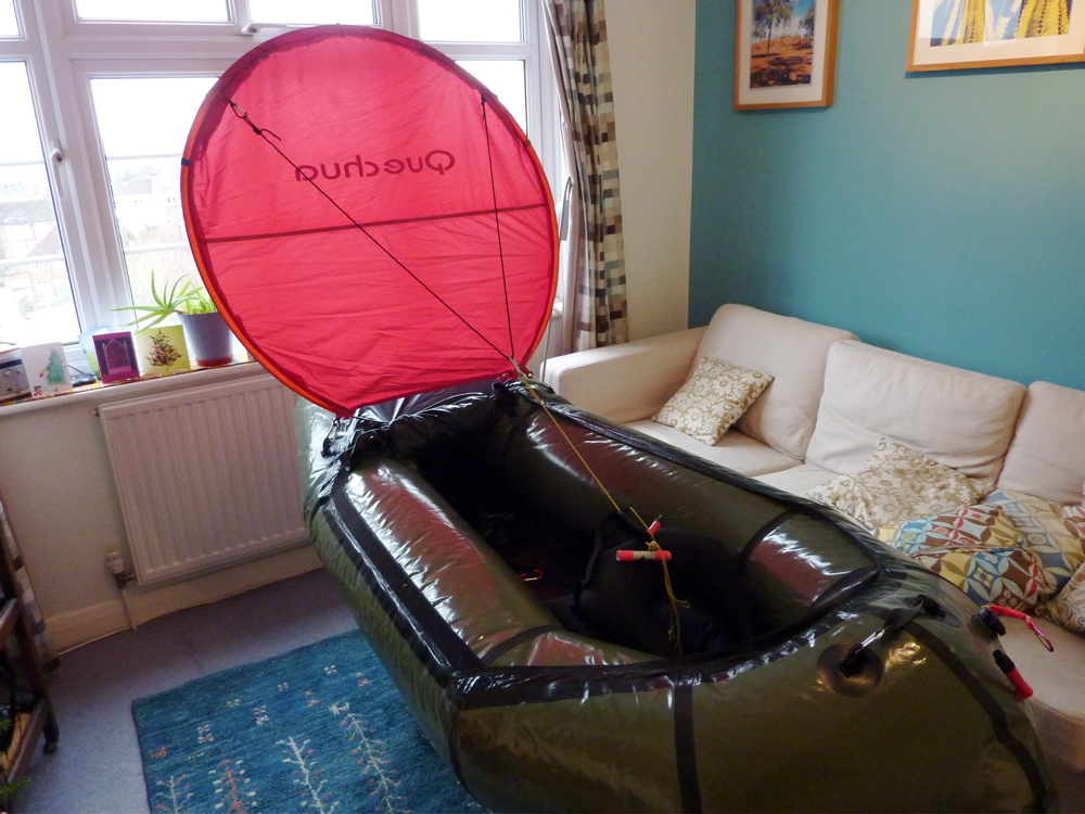 Other uses include something to sit on, a doormat for the tent, a windbreak, sunshade or umbrella. There is a slight problem: you can’t see where you’re going, especially on the shorter packraft with a metre-wide sail a metre on front of you, but on most water that ought not matter too much and if it does, I can cut in a window (like a WindPaddle) if that is the sail’s only flaw.