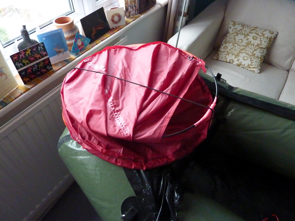Cutting the thick loop in half and rejoining it with the metal collar/tube (don’t lose this bit) gives a hoop of around 40 inches or 1 metre diametre making a sail area of 0.785 m2 (8.45 ft2) – similar to a WindPaddle, but with negligible dishing. I built up the sawn-off end with some cloth tape to stuff into the collar-tube, and then taped it all up (so it’s easily undoable).