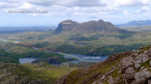 Below: almost the entire route seen from Cul Mor summit, looking southwest and west. Stac and Summer Isles in the distance.