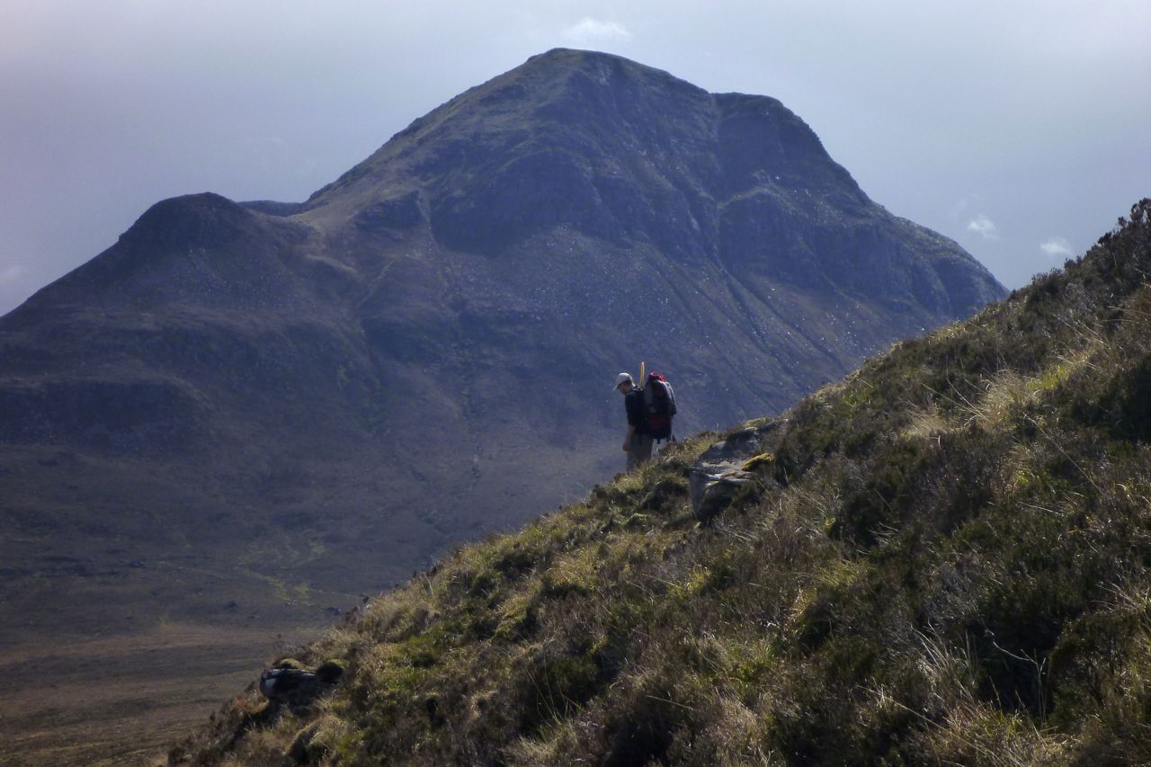 In hindsight I’d say the path climbing up and down the saddle of Suilven to pick up the jeep track west to the bothy wouldn’t have been much slower than our route around the mountain’s western prow, let alone the added appeal of taking a quick detour from the saddle to Suilven’s western summit. Since we did this, the path on the north side of the mountain has been improved.