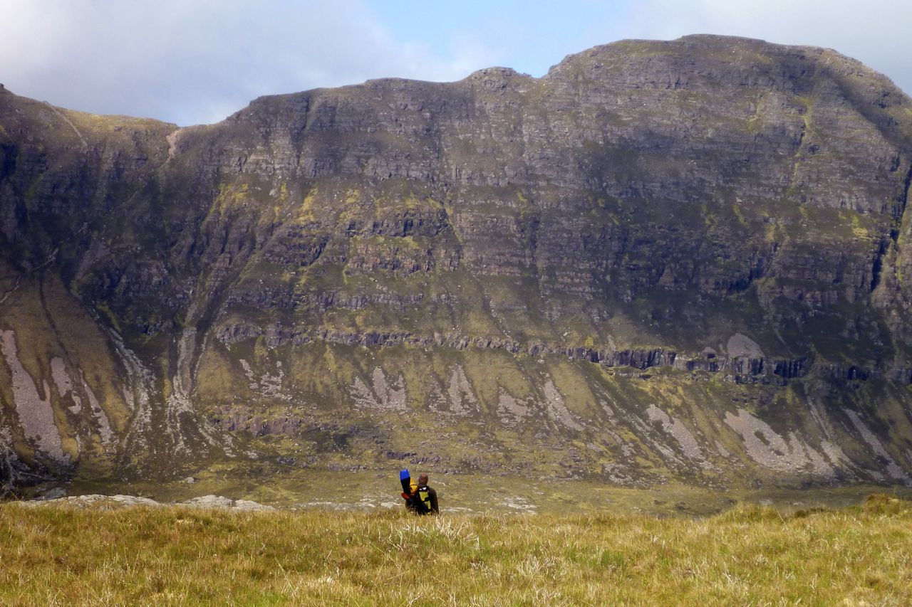 Rolling the boats up, I tried to persuade Jon that the seemingly vertical clamber up Suilven’s south face would be excellent knee therapy, but he wasn’t buying it. He had ten weeks to get into shape for a four-day trans-Pyrenean ride and didn’t want to risk it. So we set off north below the western prow of what the Norsemen called ‘the Pillar’ (below).