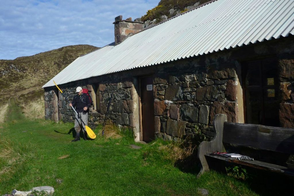 Soon we caught a view of Suileag bothy far below but the terrain got gnarlier still, winding around lochans, small passes and down steep slopes. Somewhere here Jon chose to follow an indirect low route to spare his knee and somehow managed to sneak past me while I scanned from a high point for half an hour, trying to track him down. He was behind me all the time, kettle on and yellow paddle resting by the bothy’s doorway as a marker. I needlessly paddled over Loch an Alltain Duibh, assuming the river gully just upstream would be too awkward to cross. In fact Jon had found it an easy ankle wade.