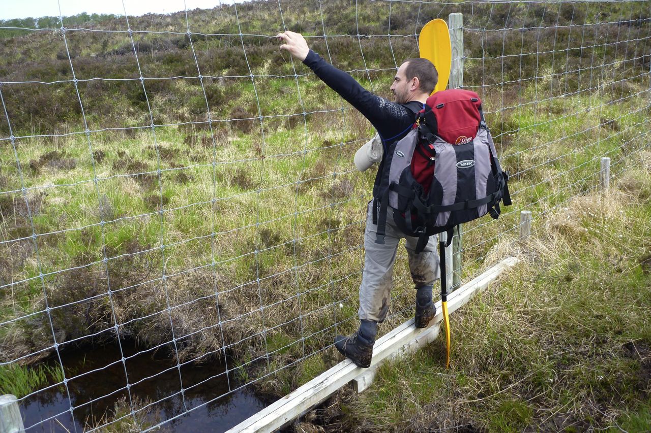 As the slope levelled off, ahead of us a deer fence cut through the scrub; we followed it until a stout corner post provided an easy hop to the other side. We were now heading directly for a bay with a small island to put in, but that was further than it looked, down small cliffs before dropping through an enchanting light birch woodland which the deer fence may have helped preserve.