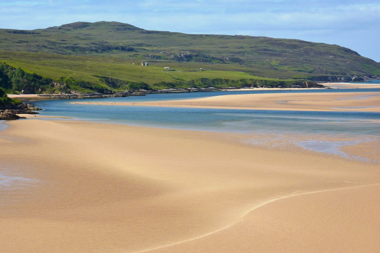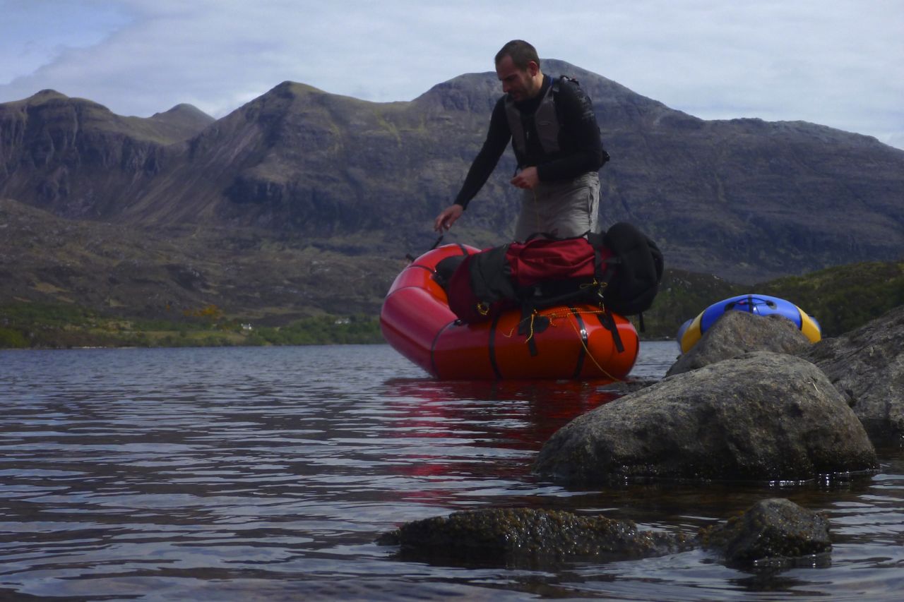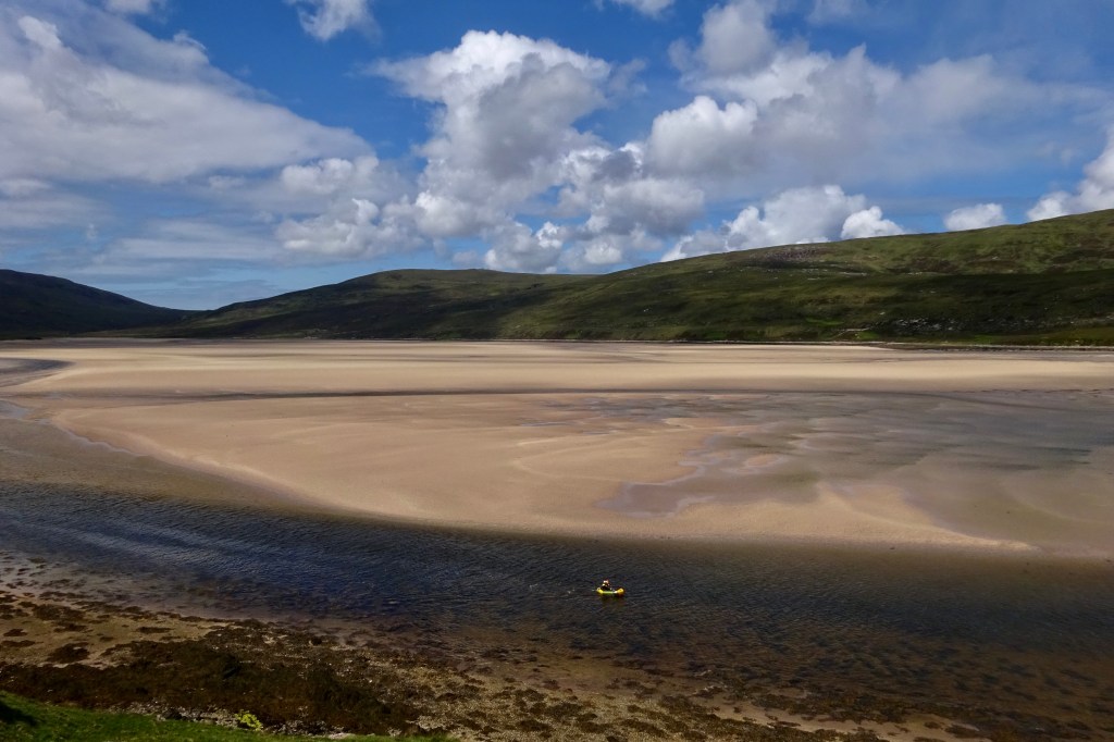 As far as I can tell, there are few other places on the regular CWT path where a packraft is worth carrying (which is probably why the path goes that way and avoids the Assynt). Except of course to get across the Kyle of Durness sea loch after the walk’s finale at Cape Wrath, if the boatman is not around and you don’t fancy the detour to the head of the loch. The image left from a few years ago must be a very low tide, but as you can see it’s potentially just a swim of a few metres. Eight years later I finally got to paddle the Kyle (below).