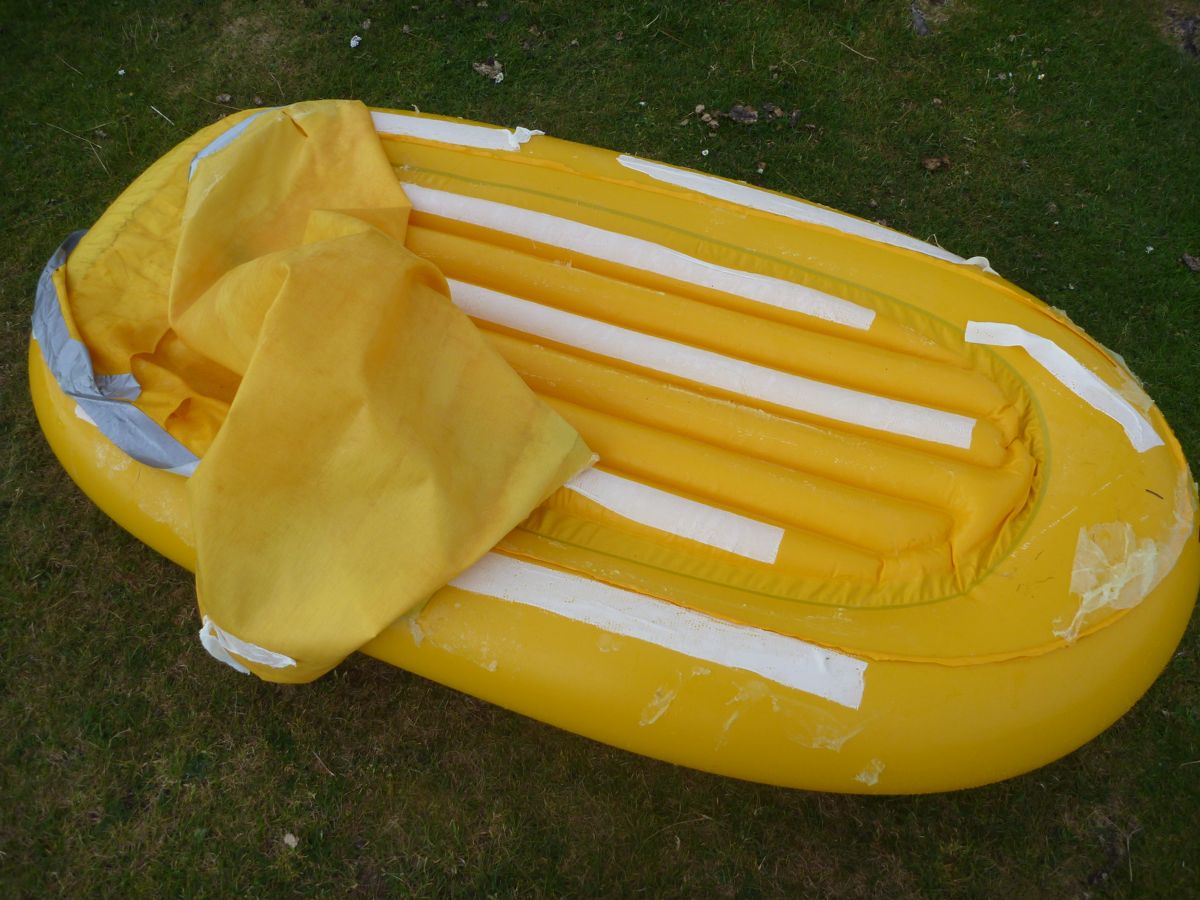 A post-sea trail inspection showed that my carefully glued floor was coming away from the Sevy’s PVC hull like damp wallpaper; that may have explained why the boat got so slow coming back. The Evo Stik didn’t take to the hull at all, or if it did, seawater soon dissolved it. At the time I was trying to save on my nice Bostik 1782 which I used elsewhere on the slack boat with no problems. Anyway, it’s not worth wasting any more glue on this boat. And who knows, perhaps the ribbed floor which has been exposed again may help restore some tracking. We’ll see next time. We’ve half a mind to repeat last year’s fabulous Suilven triathlon, but this time in a boat each.