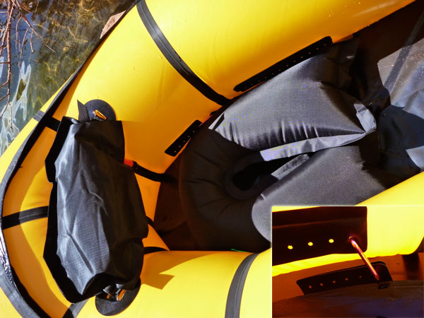 Out of the box the Flex PR comes in three sections: the load-carrying back panel incorporating the fabric strap-down flap which wraps up and around your dry bag and then cinches down at the sides. The lumbar panel is supported by a removable, pre-bent ribbed alloy stiffening rod which you want to take care not to bend. The wide hip belt slips in through a sleeve at the base of the back panel and velcros in place. And the shoulder harness slips down into another velcro sleeve with various adjustment marks. At 6′ 1″ (1.85m) and after some experimenting, I settled on the longest setting, as below left.