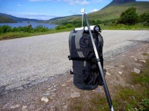 Initially, I tried using the UDB as a backpack (left) but, like trying to do that with any holdall, it’s only a short term solution that puts a huge strain on your shoulders. Plus I found the harness was poorly positioned so the pack sat high on my back, further increasing the centre of gravity, but running the shoulder straps loose (as left) didn’t work either. It became clear the included harness was not intended for anything more than short hauls. What was needed was a frame of some sort, or a better harness. You can read a summary of my experiments here. In the end the NRS Paragon pack harness and later Six Moons suited my needs best.