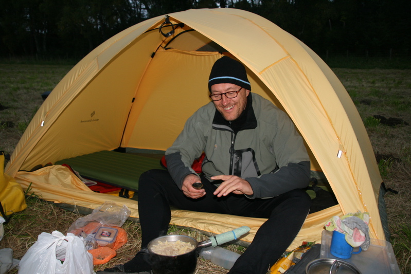 A fire was easily lit and soon we tucked into the first of our freeze-dried bag meals followed by several cups of tea. By 6.30 it was dark and Jeff had already passed out in his mozzie dome after admitting ‘This is going to be the hardest thing I’ve ever done‘.